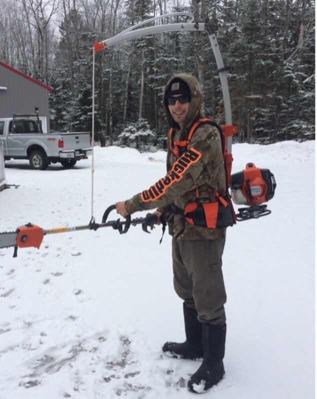 A backpack chainsaw rotates to cut both vertically and horizontally.