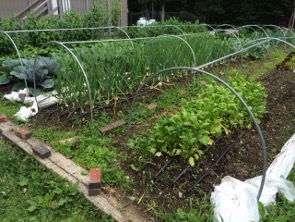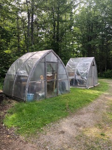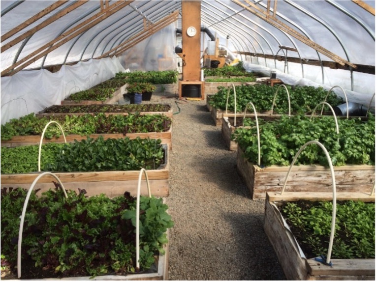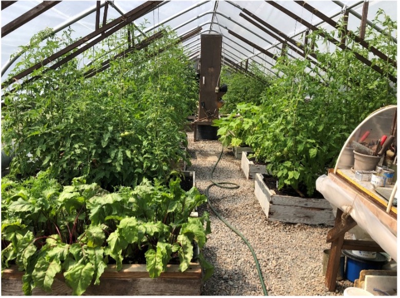 The 1100 square foot greenhouse was manufactured by the Rimol Company. It has a double layer of polyethylene film with a fan that pushes air and separates the poly layers for winter insulation. Nineteen 12 inch deep raised beds rest upon a gravel floor. The eight-inch-deep gravel floor contains air circulation tubes. During cold weather, a central tower that contains a fan draws the warmest air from the ceiling of the greenhouse and spreads the heated air through the eight-inch-deep gravel floor. Thus, the gravel floor serves as a “heat sink” that radiates up into the greenhouse air at night during the fall, winter, and spring seasons. A thermostat controls the air handler in the greenhouse that supplies heat from the outside wood boiler when necessary. In the summer, a thermostat controls an exhaust fan when necessary.