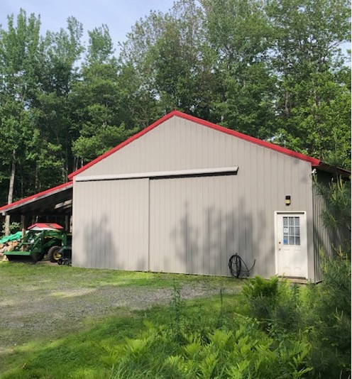 Four covered shelters contain space for gardening tools, bee-keeping supplies, chicken feed and chicken meat processing apparatus. The pole barn has a large unheated attic.